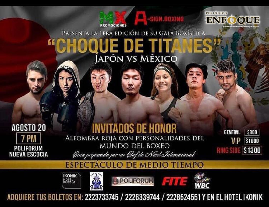 Box, Choque de Titanes, Japón VS México, cartelera completa y horarios, 09 peleas, viernes 20 de agosto de 2021. 07 P.M., Polifórum Nueva Escocia, Puebla, 07.00 P.M. MX Promociones A- Sign. Boxin presenta la 1era Edición de su Gala Boxística. Alfombra roja con Invitados especiales; Juan Paredes Miranda, medallista olímpico, Carlos Zárate, campeón mundial y Jaguar Aguirre, campeón mundial. Espectáculo de medio tiempo, además habrá cena preparada por un gran chef de nivel internacional.