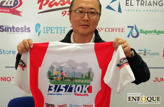 En conferencia de medios, Luis Naoki Shukuya, director de difusión de Yakult Puebla, fue el encargado de mostrar la playera conmemorativa que recibirán quienes se inscriban a cualquiera de las distancias, además de la medalla que entregarán a todos los que crucen la meta.