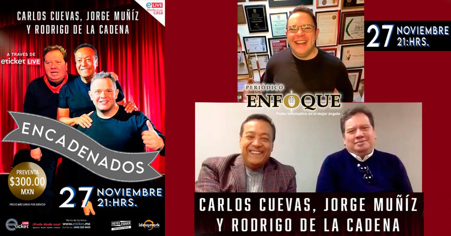 Puebla, Puebla, México. Carlos Cuevas, Jorge Muñiz & Rodrigo de la Cadena, “Encadenados”, online, viernes, 27 de noviembre de 2020 a las 09:00 P.M. (Horario de la ciudad de México). Duración del evento una hora con 30 minutos, con transmisión desde “La cueva de Rodrigo de la Cadena, casa de él, la producción es de Ergo Films Company SC (propiedad de los hijos de Carlos Cuevas).
