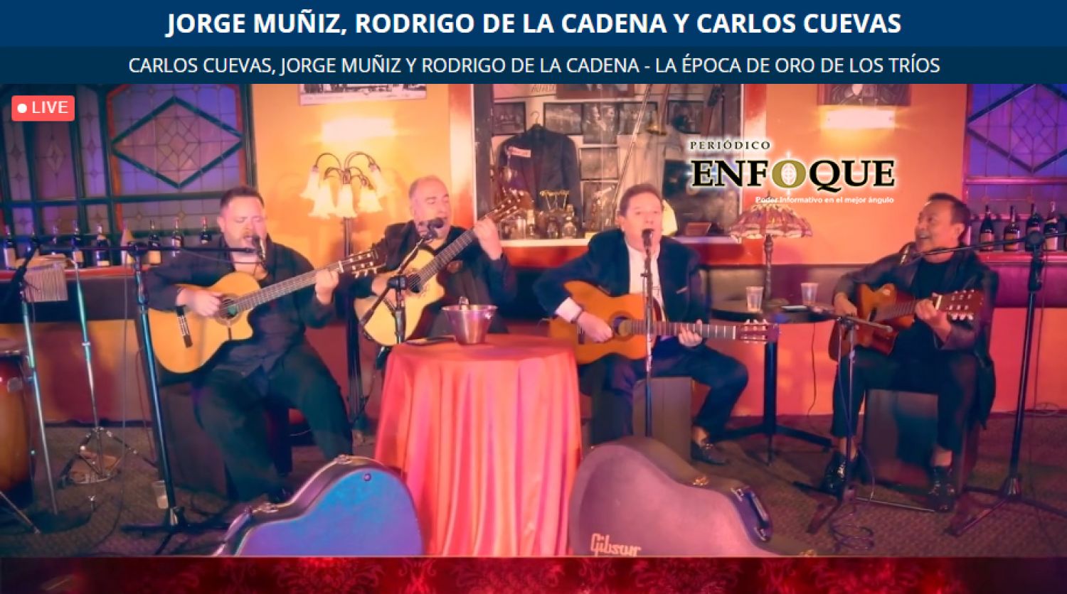 Puebla, Puebla, México. Carlos Cuevas, Jorge Muñiz y Rodrigo de La Cadena, cantaron lo mejor de “La época de oro de los tríos”, en su streaming, el pasado sábado 12 de junio de 2021 a las 09:03 P.M. (Horario de la ciudad de México). Los cuatro, tanto cantaron, como tocaron al mismo tiempo sus guitarras, recordando los éxitos de “Los Panchos”, “Los Dandys”, “Los Tres Ases” y “los Tecolines”, acompañados por el guitarrista Fernando Correa. El show fue grabado con anterioridad.
