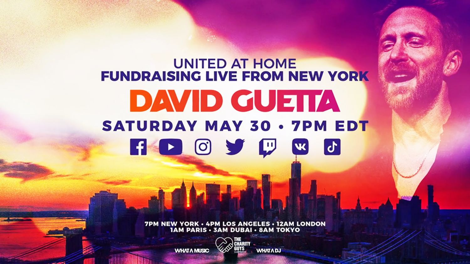 El titulo original es; David Guetta / United at Home - Fundraising Live from NYC ! Saturday, may 30 de 07:00 P.M. Evento online.