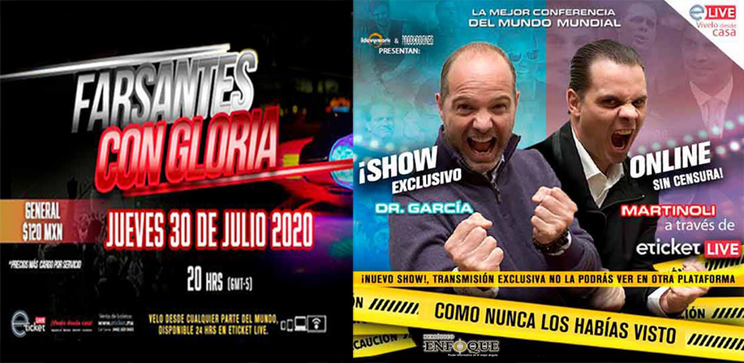 Puebla, Puebla, México. Farsantes con gloria. 08:00 P.M. Jueves, 30 de julio de 2020. La historia personal y laboral de Luis García Postigo y Christian Martinoli en un show de un narrador y un analista de futbol, irreverencia, humor negro y sarcasmo. Duración del evento 90 minutos.