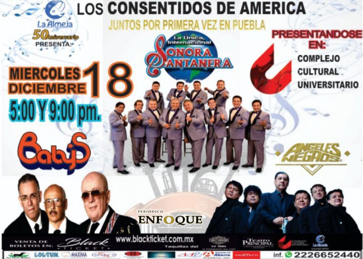 Este miércoles 18 de diciembre por primera vez en Puebla se presentan en un mismo concierto “La Única Internacional Sonora Santanera”, “Los Ángeles Negros” y “Los Babys”, grupos que por su impecable trayectoria artística, cada uno en su género, son clásicos referentes de la música popular en español y sin duda alguna son “Los Consentidos de América”. Cada uno llega festejando en grande.