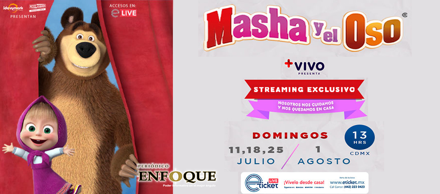 Ciudad de México. Masha y El Oso streaming, versión teatral, domingos; 11, 18, 25 de julio y 01 de agosto de 2021 a la 01:00 P.M. (Horario de la ciudad de México).