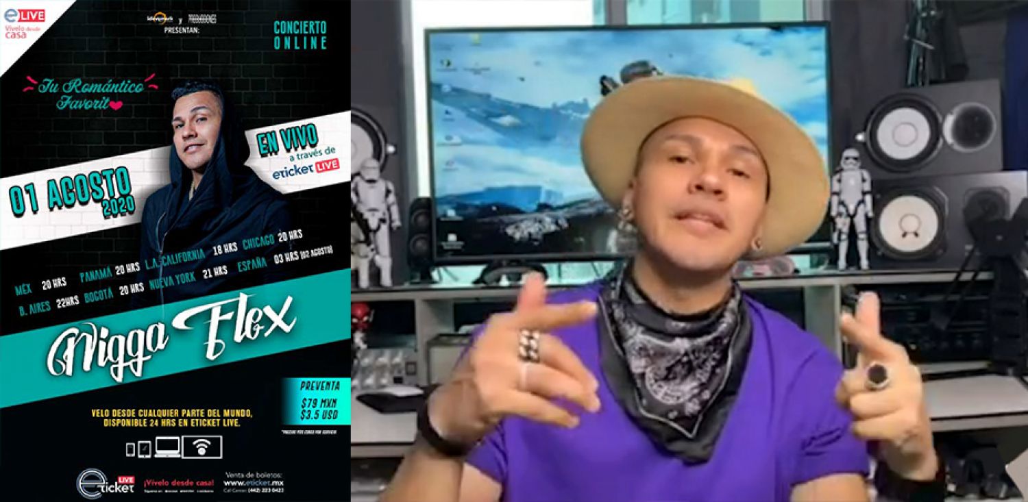 Puebla, Puebla, México. Nigga Flex, Show Online, 08:00 P.M. Sábado, 01 de agosto de 2020. Será normal, con músicos en vivo, sin público, se acondicionará un lugar espacioso de 1 metro para los músicos y con la infraestructura muy amplia que sugiere el Ministerio de Salud en Panamá además de requisitos y permisos que les tienen que otorgar. En su repertorio presentará sus éxitos clásicos, sin embargo no podrá realizar las dinámicas con su público físico que antes hacía en el escenario.