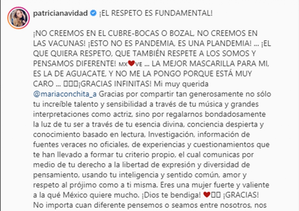 María Conchita Alonso- Ella loca no es (cantan las dos), ahora yo, a mí me dijeron; Paty piensa como tú, hace dos, tres meses, ¿cómo, que? No lo puedo creer y empecé a ver lo que tu ponías, que razón, que cuerda esta, y lo que ella dice “no me crean”, no me crean, investiguen, ¡No escuchen las noticias!, investiguen no una vez, porque quieren lo que creamos, pero sigue buscando y sigue buscando y sigue buscando, encontraran la verdad y yo de verdad yo no creo en las “Mascarillas” lo más importante en la vida es el respeto, yo lo exijo. Para que se molestan si tú no usas la “Mascarilla” si tú la tienes puesta, si tú crees en la “Mascarilla” que te está protegiendo, pues te está protegiendo