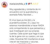 María Conchita Alonso; Completamente, la vacuna, no creo en la vacuna, ahora, si tú te la pones ya no te vas a contagiar, entonces a ti te lo respeto, a ti que te importa que yo no me la ponga.