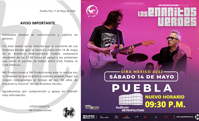 Nuevo horario para Los Enanitos Verdes, 09:30 P.M. 14 de mayo 2022, Auditorio Metropolitano Puebla