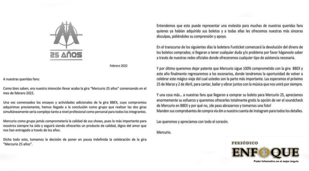 La gira “Mercurio 25 años” en pausa, pero la gira BBEX continúa los días; 25 de marzo y 2 de abril de 2022. (Comunicado del grupo)
