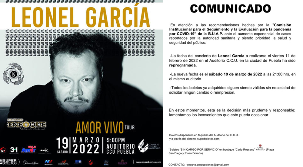 Leonel García en Puebla, nueva fecha reprogramada para 19 de marzo de 2022, fecha anterior 11 de febrero de 2022 (Comunicado)