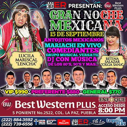 Gran Noche Mexicana, 15 de Septiembre de 2019, Hotel Best Western Plus de Puebla