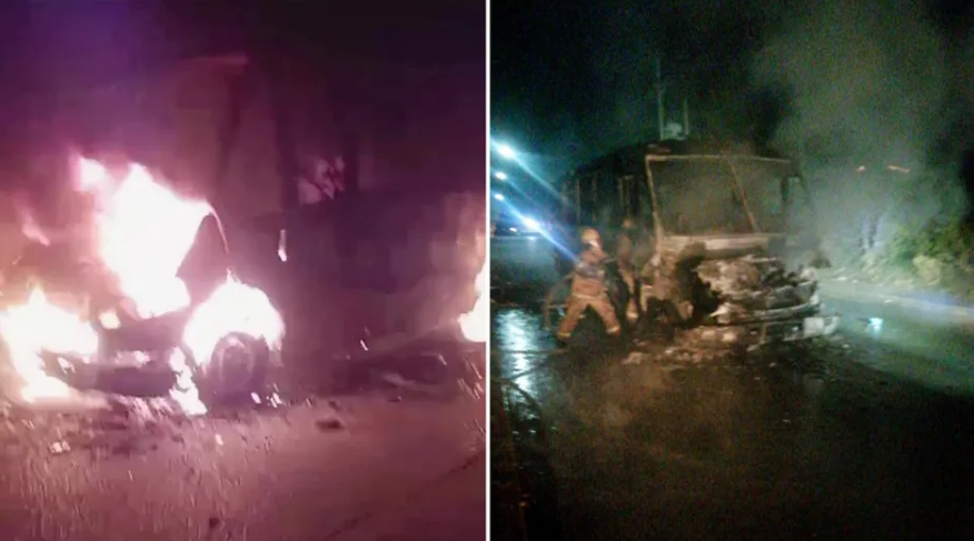 Civiles armados le prenden fuego a camión de transporte en Temixco, Morelos