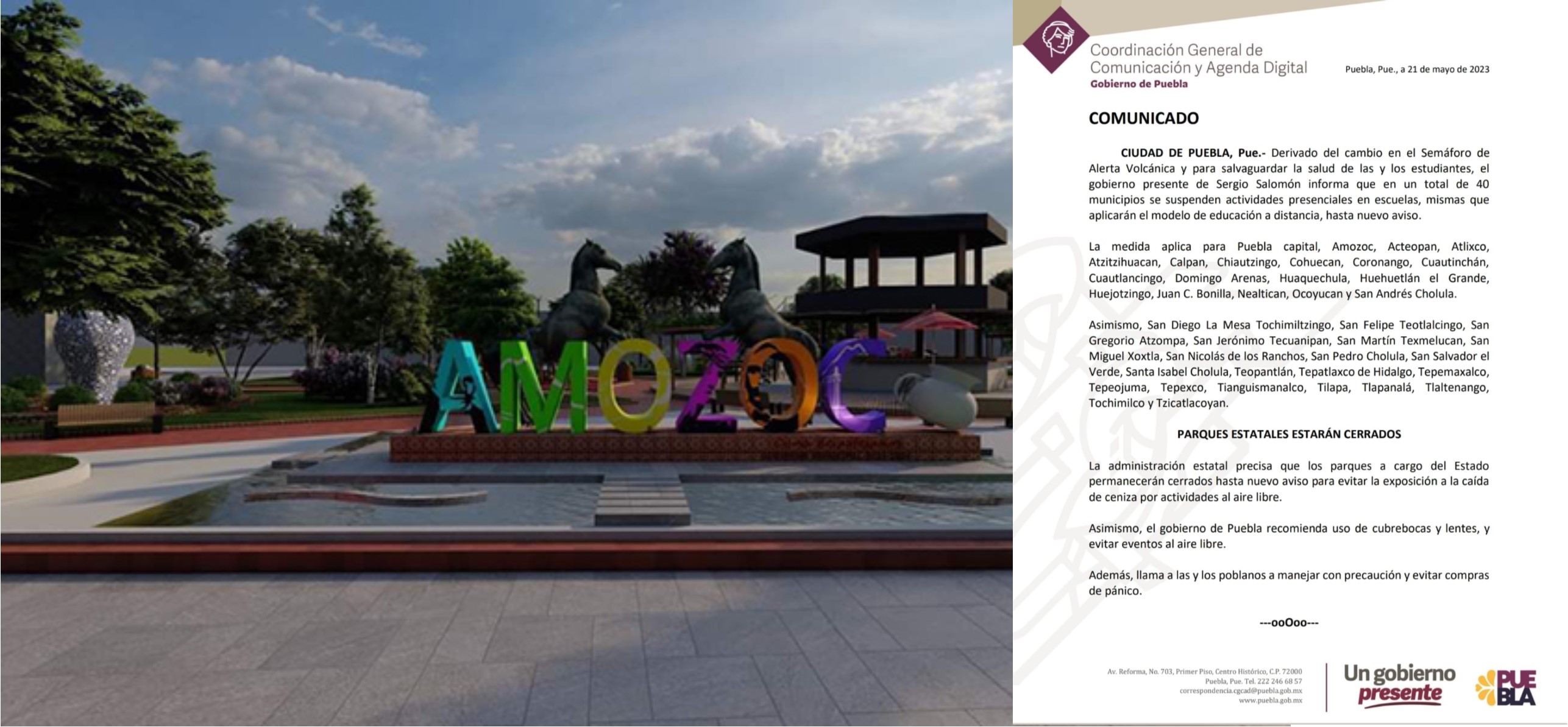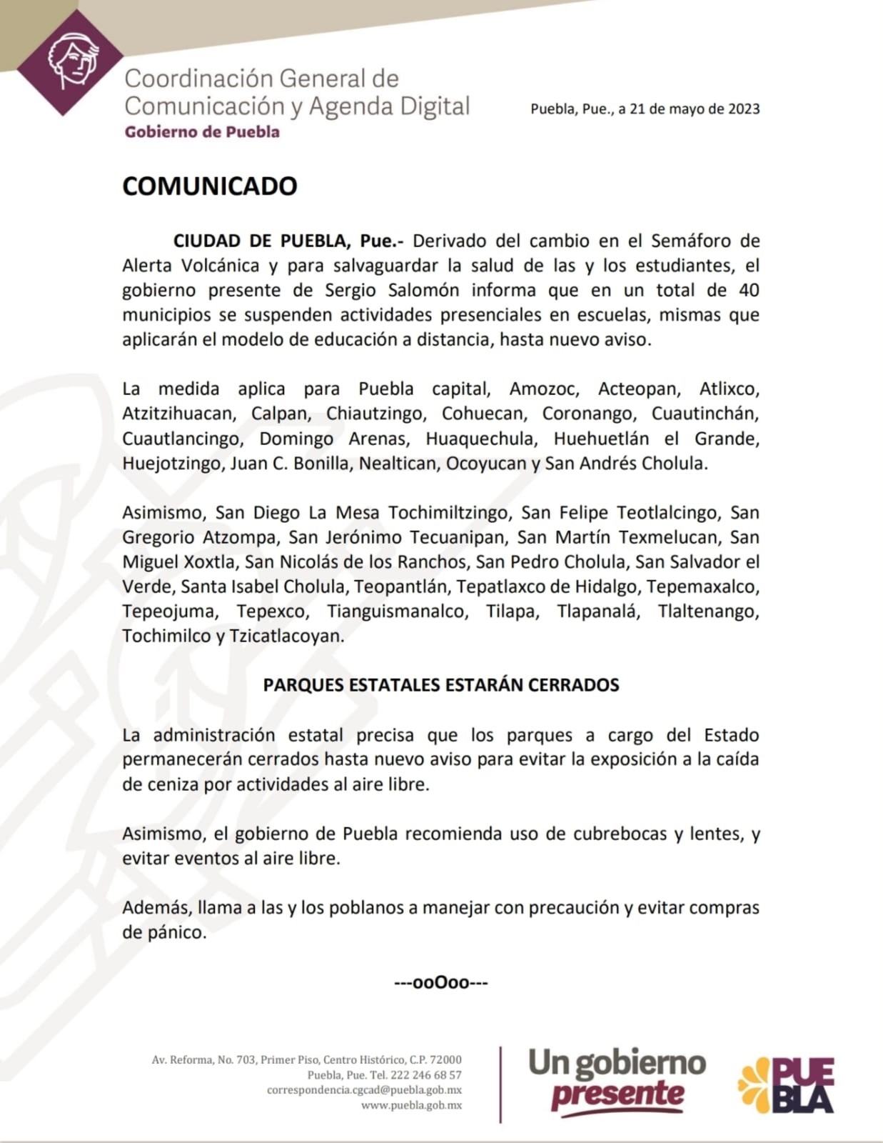 El gobierno de Puebla recomienda uso de cubrebocas, lentes y evitar eventos al aire libre. Además, llama a las y los poblanos a manejar con precaución y evitar compras de pánico.