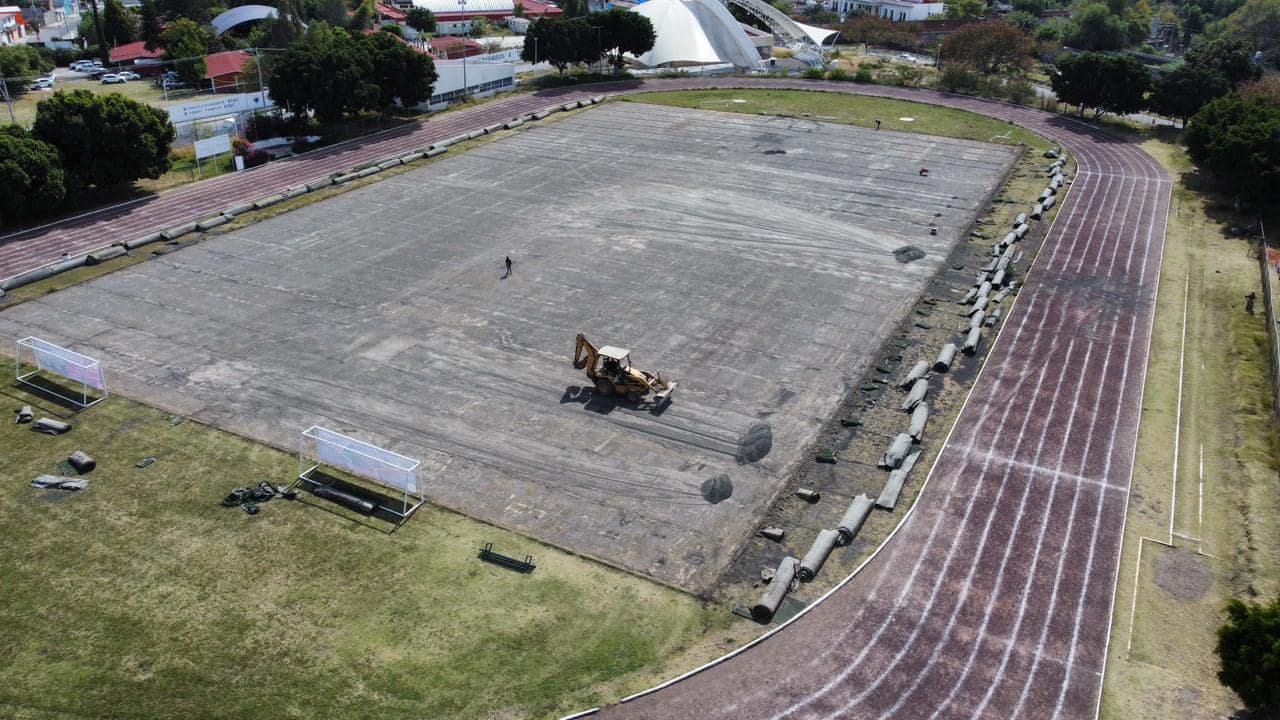 La rehabilitación de la cancha de futbol contempla el suministro y colocación de 6 mil 484.35 metros cuadrados de pasto sintético, rehabilitación de porterías, suministro de redes oficiales banderines y construcción de 332.90 metros de dentellón, mientras que para la pista de atletismo se realizará el suministro y colocación de 247.79 metros cúbicos de tezontle y arcilla roja, escarificado o rastreo de 495.58 metros cúbicos de terreno natural, además de la aplicación de 4 mil 955.78 metros cuadrados de riego de sello.