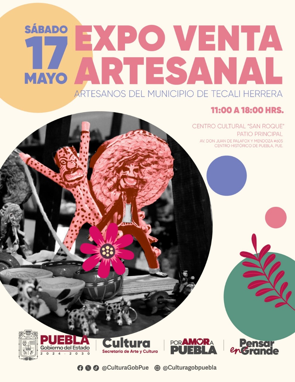Para ello, este 17 de mayo acudirán a dicho Centro Cultural artesanas y artesanos de Tecali de Herrera, mientras que el día 18 serán productores provenientes de Zacatlán, en horario de 10:00 a 18:00 horas.