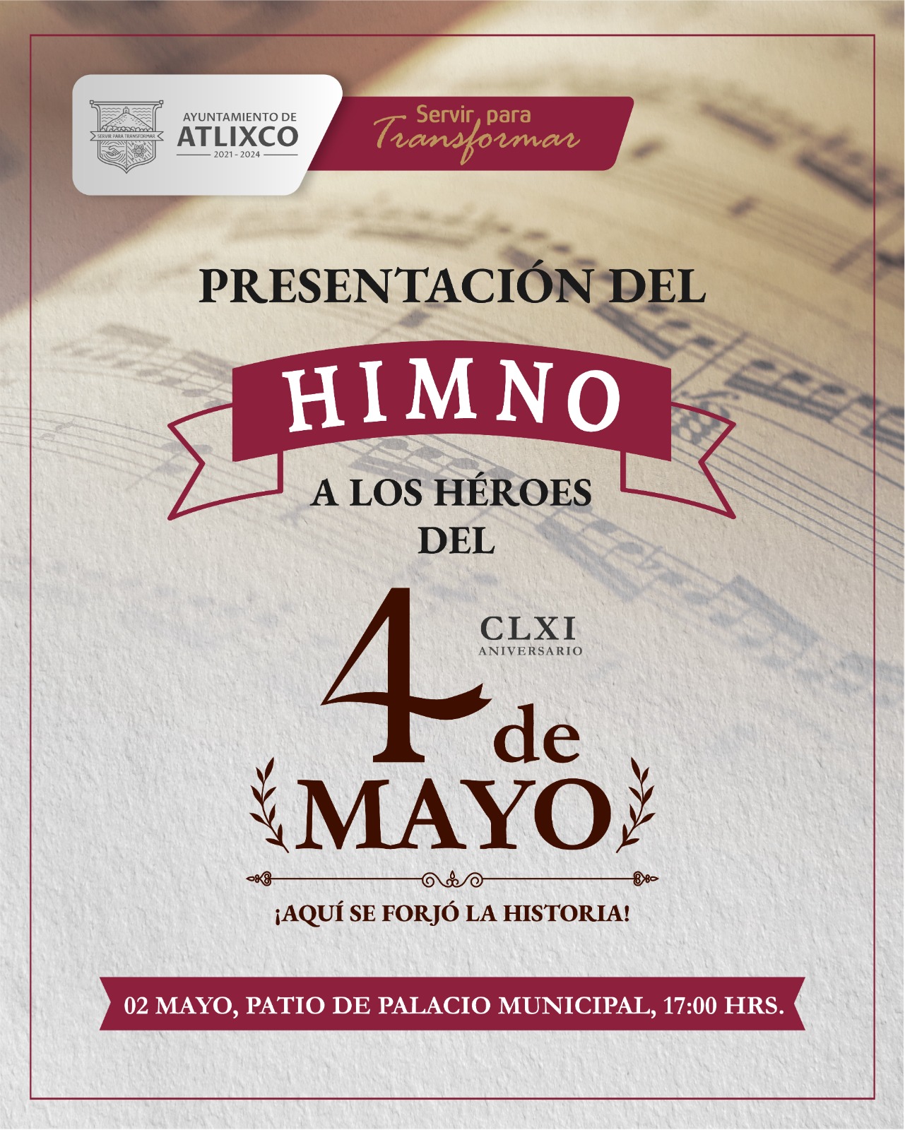 Como primer hecho, a fin de revivir, así como promover el arraigo e identidad en la comunidad estudiantil, a través de la Jefatura de Cultura y Tradiciones, con la participación de profesionales en la materia, se rescatará y presentará el Himno Conmemorativo “Héroes del Cuatro de Mayo”, acción que sumará a la preservación del legado artístico de Atlixco.
