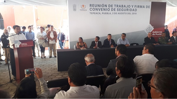Tepeaca, Puebla. Este sábado, el gobernador del estado, Miguel Barbosa Huerta firmó el convenio en materia de seguridad, debido a que recientemente hubo un enfrentamiento con bandas criminales por el robo de hidrocarburo, por lo que aseguró que este convenio no pretende desplazar a la autoridad municipal, sino que buscará una corresponsabilidad con todos los poderes.