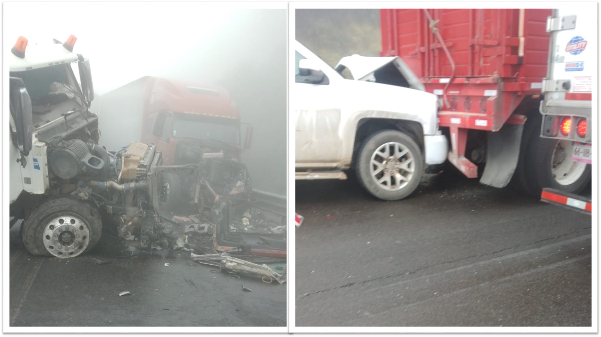 De acuerdo con la primera versión de los hechos, dos vehículos de carga tuvieron un aparatoso choque, debido a que la autopista se encuentra llena de neblina, suceso que ocasionó el impacto de las demás unidades.