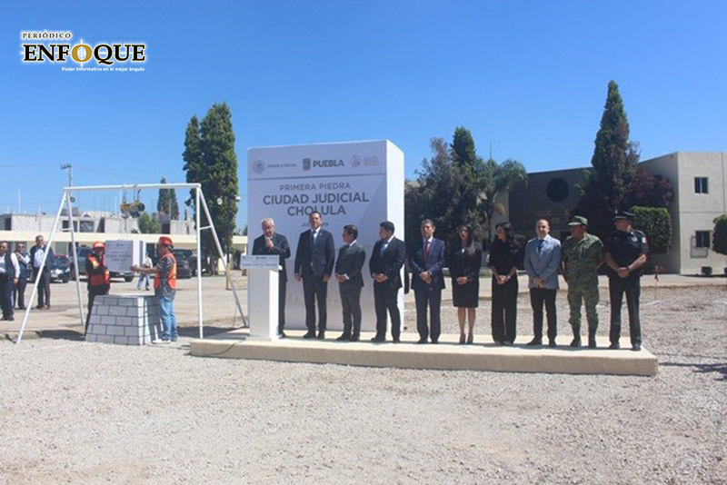 San Pedro Cholula, Pue. En el predio de los Juzgados de este distrito judicial se colocó la primera piedra de la Ciudad Judicial de Cholula con una inversión bipartita de más de 16 millones de pesos entre Ayuntamiento y Poder Judicial, obra que estará concluida en mayo del 2019.