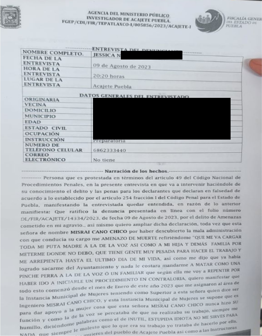 Acajete, Pue.- Por una presunta agresión física en contra de la joven Jessica Nayeli N., fue denunciada ante la Fiscalía General del Estado (FGE) de Puebla la directora de la Instancia de la Mujer del ayuntamiento de Acajete, Mizrain Cano Chico.
