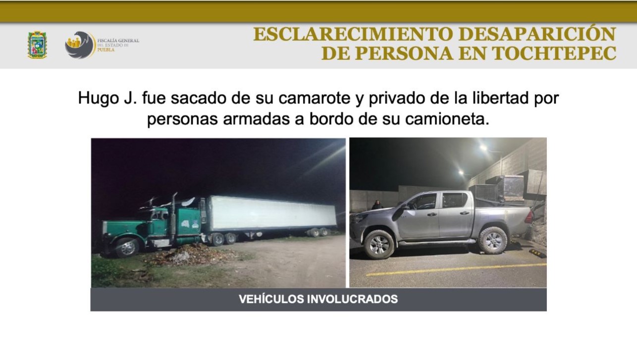 En conferencia de prensa presida por el titular de la dependencia, Gilberto Higuera Bernal, se mencionó que, en relación al caso, el pasado18 de junio del 2023, elementos de Seguridad Pública del estado en el municipio de Tochtepec detuvieron a José Cristóbal N. y Alejandro N. a bordo de una Toyota Hilux, color gris, la cual había sido reportada como robada, y en ella transportaban equipo de luz y sonido robados que eran de propiedad de Hugo J, quien había sido privada de su libertad ese mismo día.
