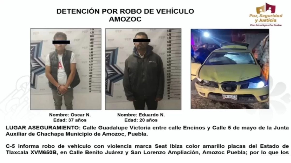 De acuerdo a la información por parte de la dependencia, recibió un reporte por parte del número de emergencia 911 para reportar que en la calle Guadalupe Victoria entre la calle Encinos y 5 de mayo en la junta auxiliar de San Salvador Chachapa en el municipio de Amozoc, unos sujetos armados habían robado un vehículo tipo Seat Ibiza, color amarillo con placas de circulación del estado de Tlaxcala.