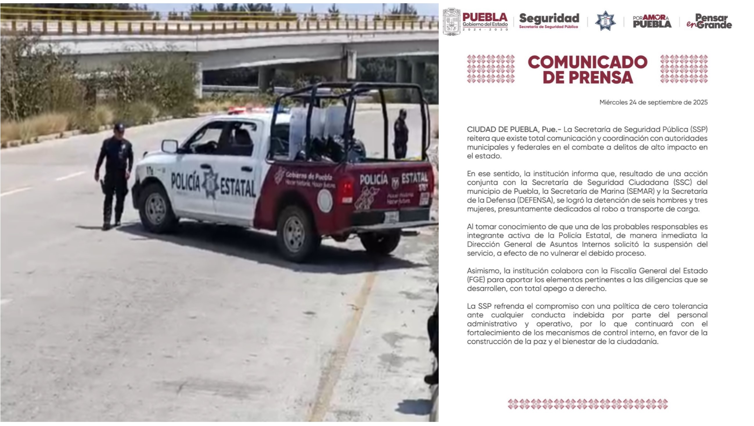 A través de un comunicado de la Secretaría de Seguridad Pública (SSP) informó que una de las nueve personas aseguradas en el Periférico Ecológico por robo de carga se identificó como agente activo de la Secretaría.