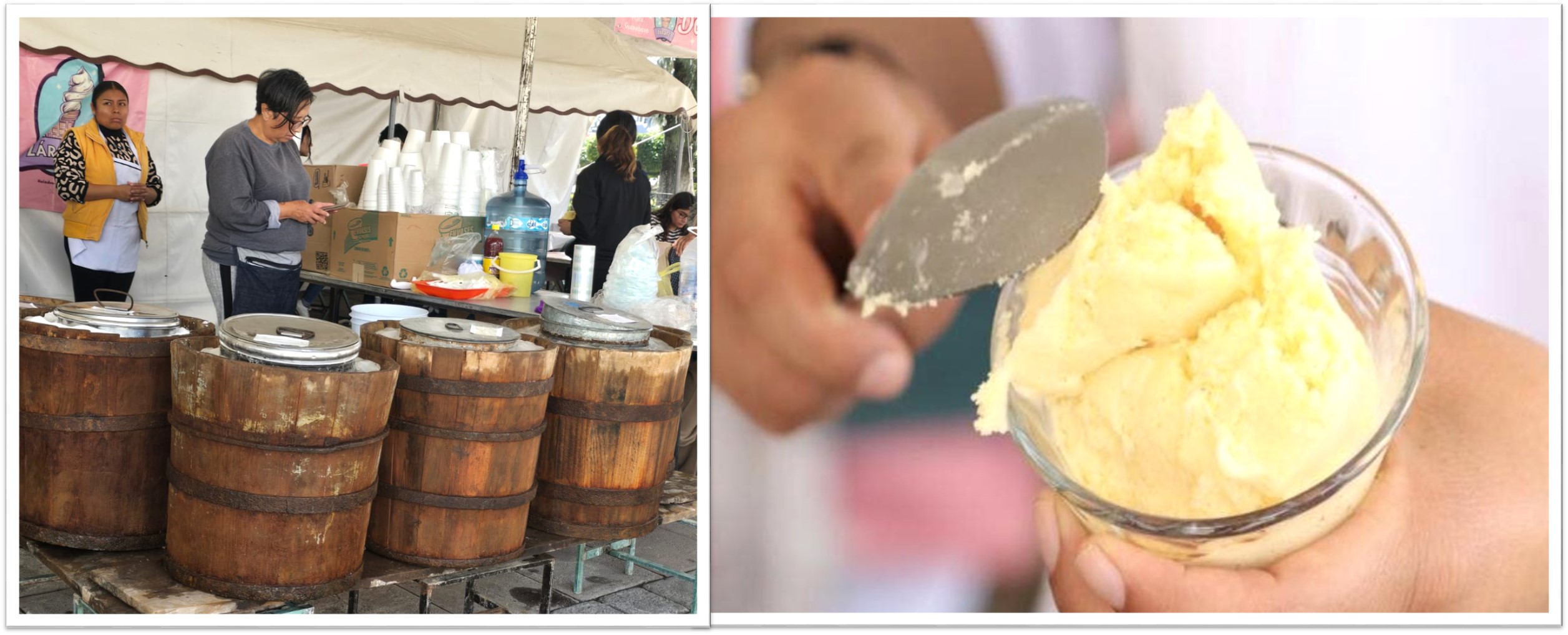 A decir de los heladeros del lugar, este postre se elabora en tinas de madera, donde se coloca hielo, y en el centro se ubica el clásico cilindro metálico utilizado en la preparación de nieves y helados; conserva la consistencia y el sabor, y que la receta original ha sido heredada de generación en generación.