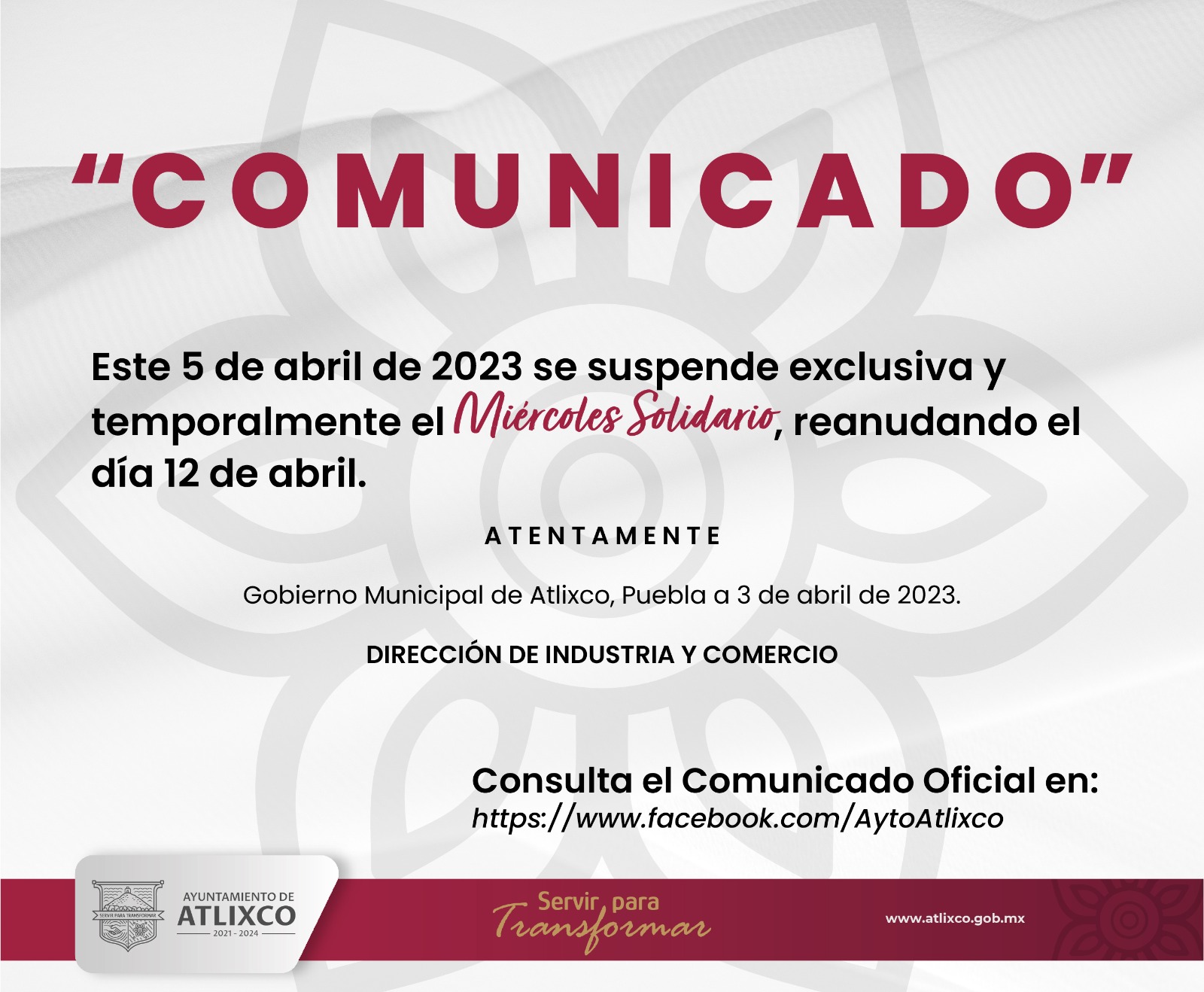 Por tal motivo, se informa a las y los comerciantes en general (semifijo, ambulante, fijo) que se suspende exclusiva y temporalmente el “Miércoles Solidario” este 5 de abril de 2023 y se realiza con la observación de seguir respetando el primer cuadro de la ciudad y las principales avenidas como Calle Libertad, Zócalo, 4 norte- sur, independencia, Av. Manuel Ávila Camacho, de acuerdo al artículo 5 del Reglamento de Mercados, Tianguis, Centrales de Abastos o de Acopio y Comercio en Vía Pública del Municipio de Atlixco, Puebla.
