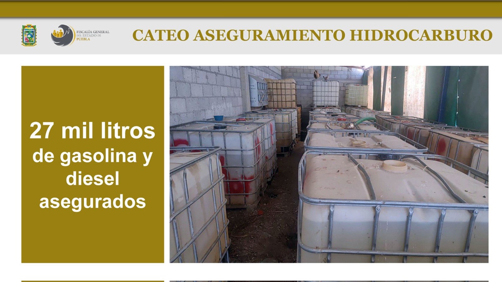 En rueda de prensa, la Fiscalía de Puebla informó que mediante una investigación se determinó que agentes de dicha dependencia estatal ejecutaran un cateo en una vivienda, acción que se realizó el pasado 15 de febrero en donde se hallaron 27 bidones de plástico con capacidad de mil litros cada uno, que almacenaban 27 mil litros de combustible ilegal con diésel y gasolina, además de 8 bidones vacíos.