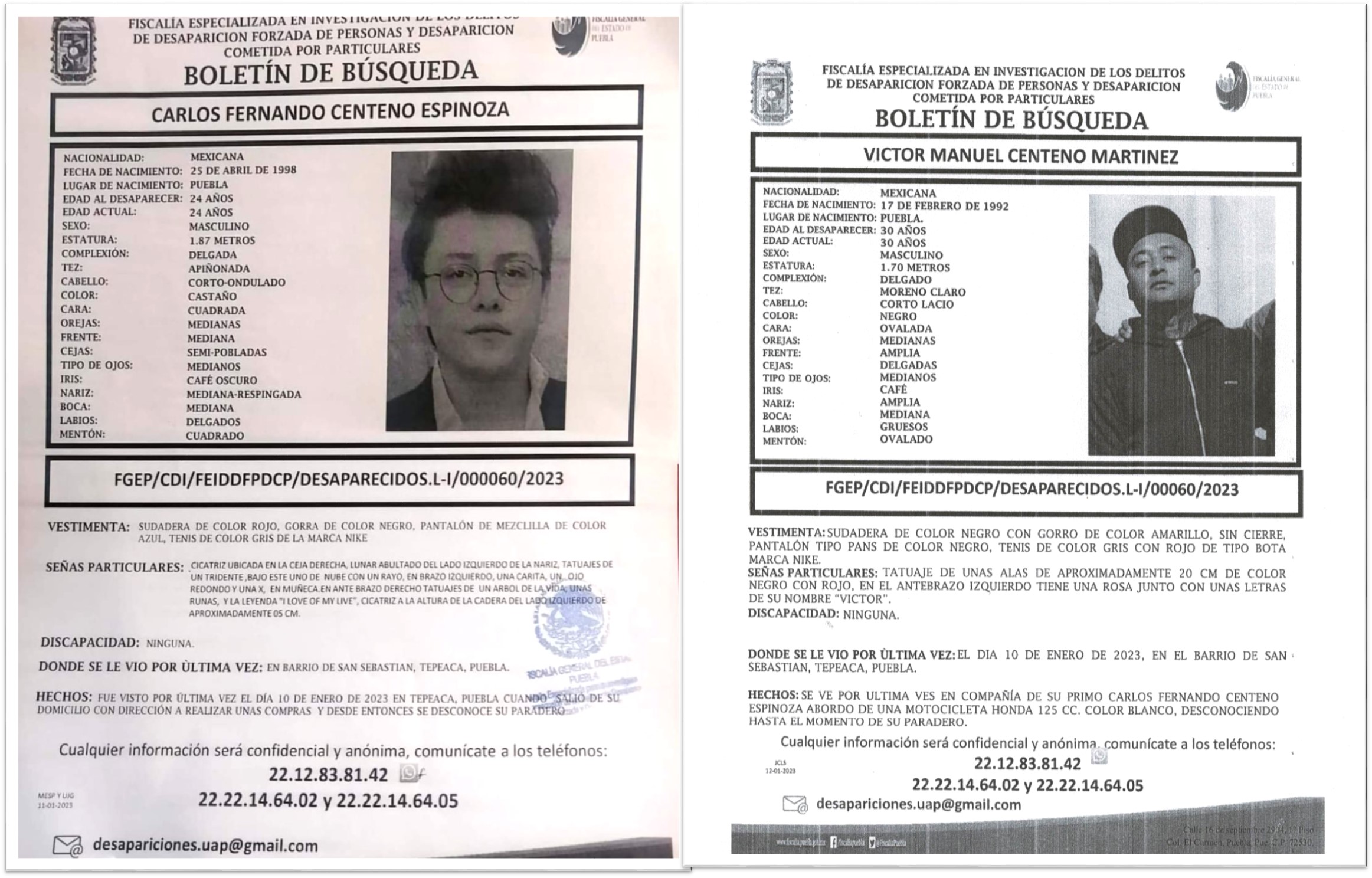 Por otro lado, se sabe que el acompañante del joven Carlos se llama Víctor Centeno Martínez quien al momento de salir ambos abordaron una motocicleta, sin embargo, ya no regresaron a su punto de origen, lo que alarmó a sus familiares quien también denunciaron la desaparición ante las autoridades ministeriales.