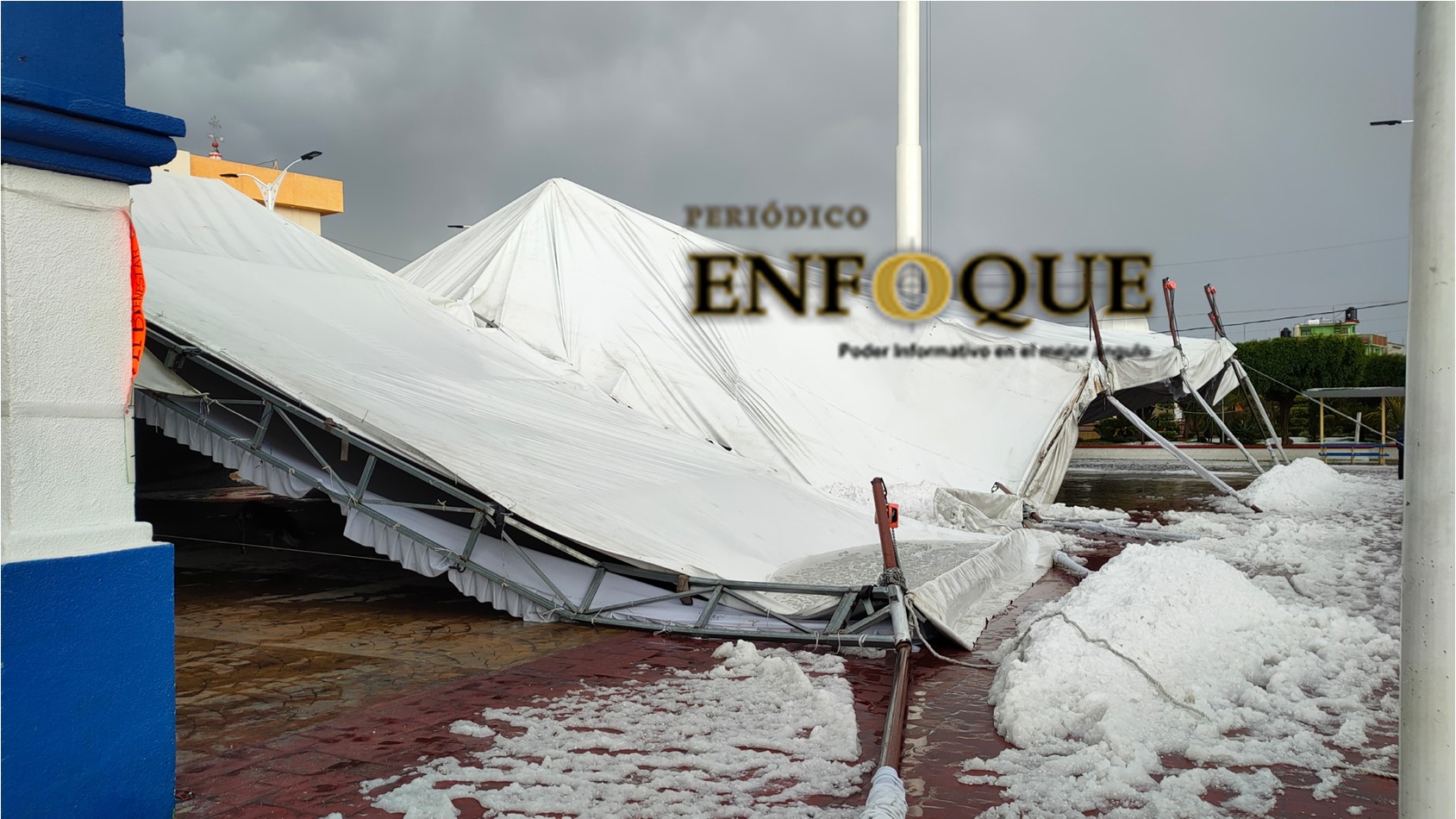 Personal de Protección Civil Municipal recorre la zona para conocer los daños materiales, el granizo alcanzó medio metro de altura, lo que provocó que el domo de la explanada de la presidencia se venciera y aplastara algunos carros y una patrulla.