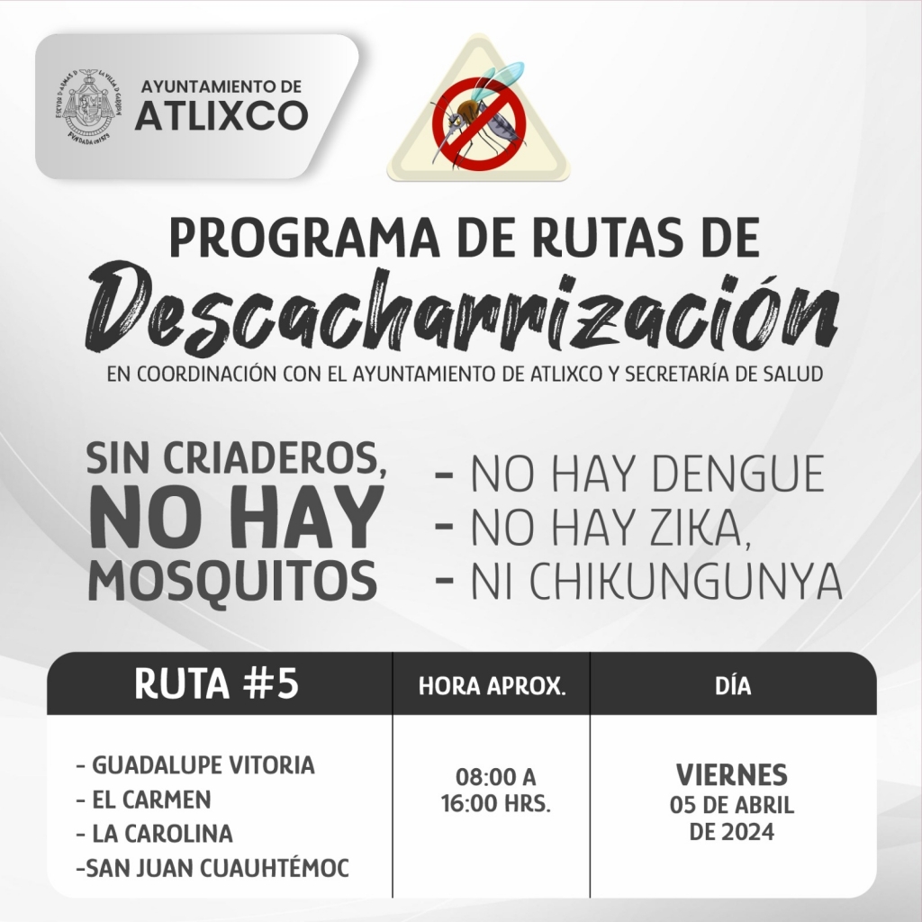 La Secretaría de Salud en coordinación con el Gobierno Municipal de Atlixco, invitan a las familias a participar en la Jornada de Descacharrización para prevenir y erradicar los criaderos del mosquito transmisor del Dengue, Zika y Chinkungunya.