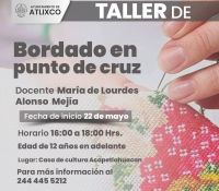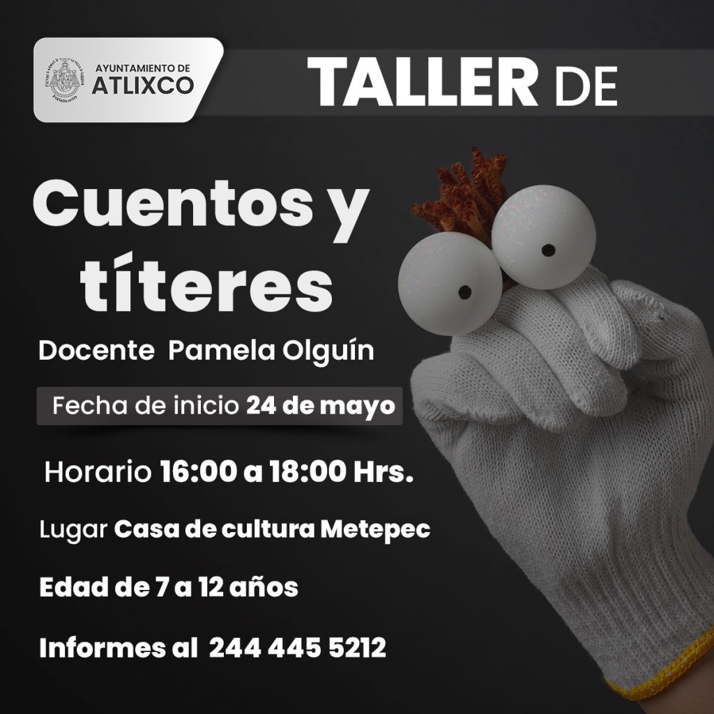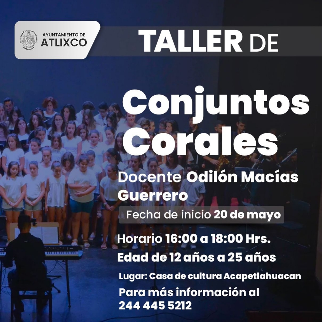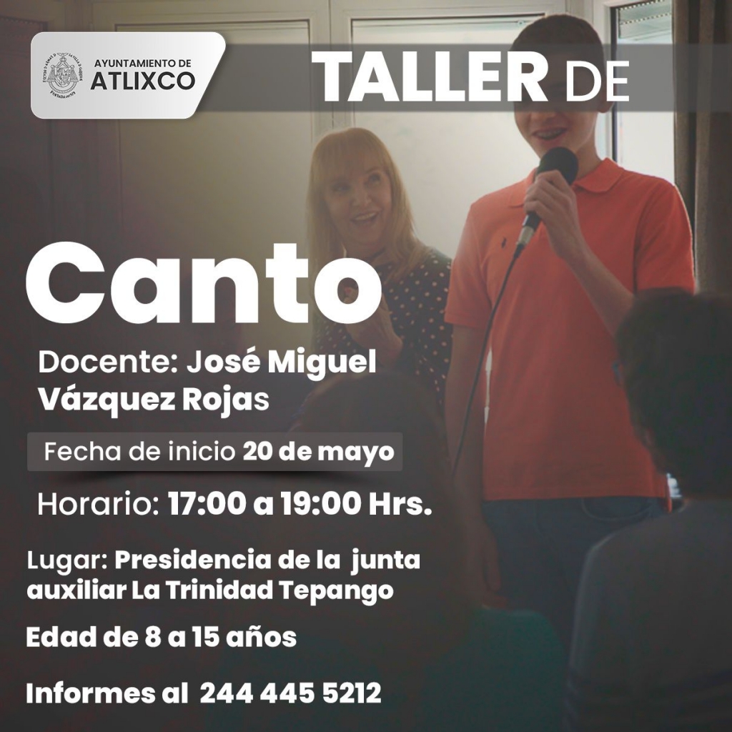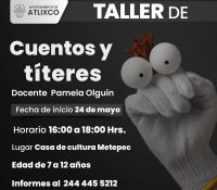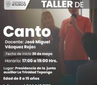 Del 20 de mayo al 09 de agosto, los talleres de: Conjuntos Corales, Rescate del Vestuario de China Atlixquense “Pañoleta”, Bordado en Punto de Cruz: se impartirán en Casa de Cultura Acapetlahuacan, mientras que, del 24 de mayo al 09 de agosto, el taller de Cuentos y Títeres será brindado en la junta auxiliar de Metepec. Por último, en la Trinidad Tepango se llevarán a cabo clases de canto desde el lunes 20 de mayo.