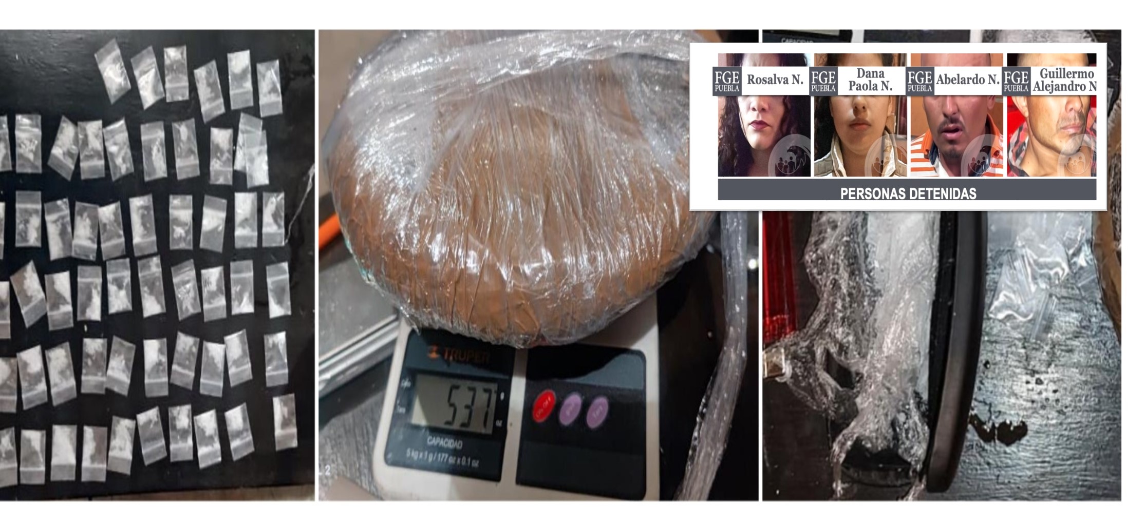 En Amozoc, las investigaciones de la Fiscalía por narcomenudeo, dejaron como resultado a un total de cuatro detenidos, dos motocicletas aseguradas y el decomiso de diversas cantidades de cristal y marihuana.