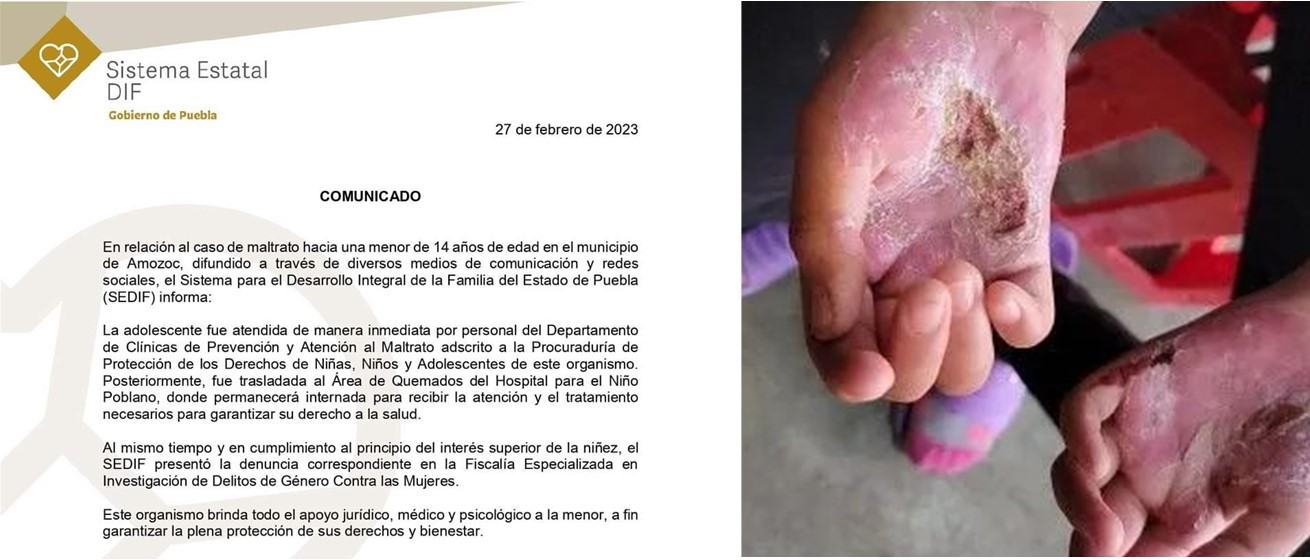 Tras la denuncia ciudadana, el Sistema para el Desarrollo Integral de la Familia del Estado de Puebla (SEDIF) tomó cartas en el asunto y la menor de edad recibió atención inmediata por personal del Departamento de Clínicas de Prevención y Atención al Maltrato, adscrito a la Procuraduría de Protección de los Derechos de Niñas, Niños y Adolescentes de este organismo.