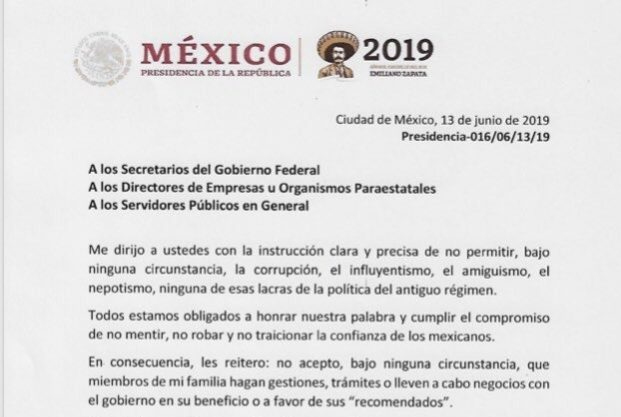 “En consecuencia, les reitero: y seguido no acepto, bajo ninguna circunstancia, que miembros de mi familia hagan gestiones, trámites o llevan a cabo negocios con el gobierno en su beneficio a favor de sus ‘recomendados’.