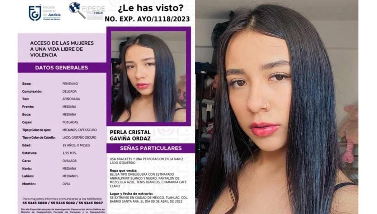 Fue el pasado 14 de abril que se publicó una Alerta Amber para encontrar a Perla Cristal Gaviña Ordaz de 19 años de edad, quien al principio se creyó que se encontraba extraviada en la alcaldía Tláhuac en la Ciudad de México; de acuerdo con los datos emitidos a través de la ficha de búsqueda, se indicaba que lo último que usó la joven fue una blusa tipo ombliguera con estampado de animal print con colores blanco y negro; también portaba un pantalón de mezclilla azul, tenis blancos y chamarra café claro.