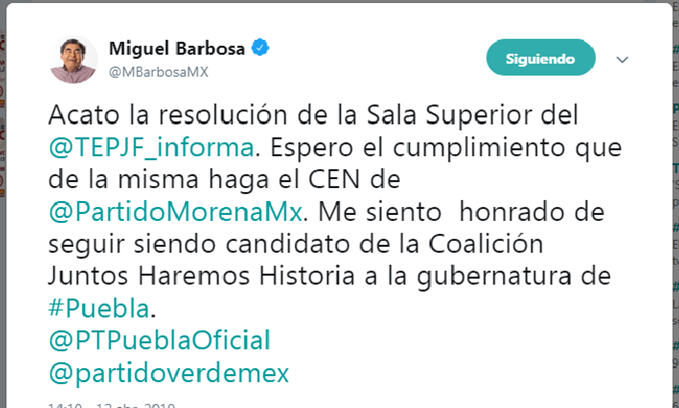 Acata Barbosa resolución del TEPJF; pide a Morena a que funde su candidatura