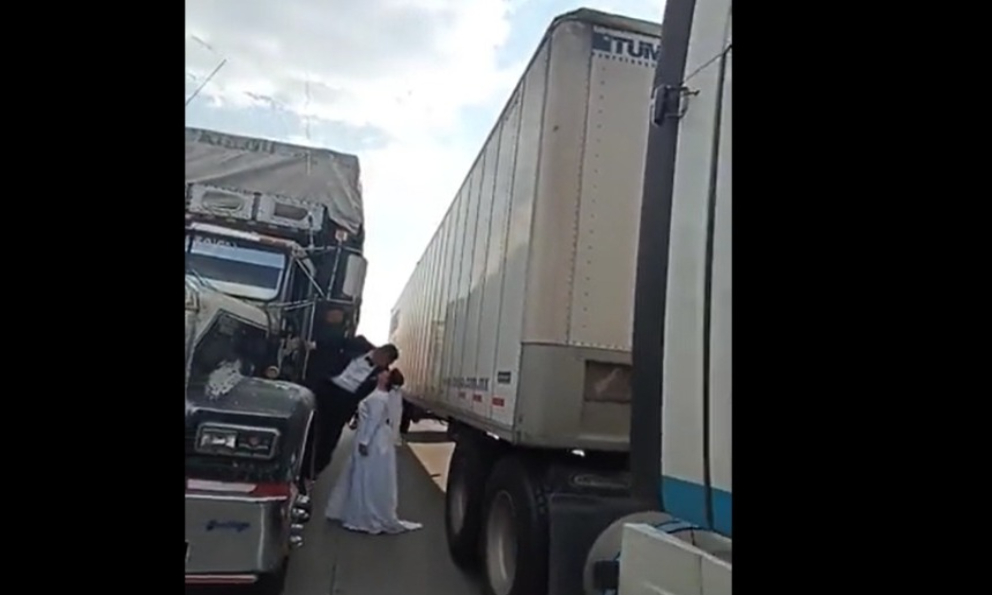 Fue así que, entre la multitud de automóviles y tráileres que quedaron varados en el bloqueo, la pareja posó para la lente de Jahaziel y capturó ese como uno de los momentos que caracterizará su historia romántica.