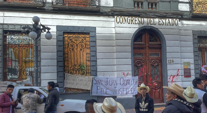 Puebla, Pue.- Pobladores de Coyomeapan se manifestaron frente a las instalaciones del Congreso del Estado de Puebla donde pidieron justicia por el asesinato de tres compañeros.