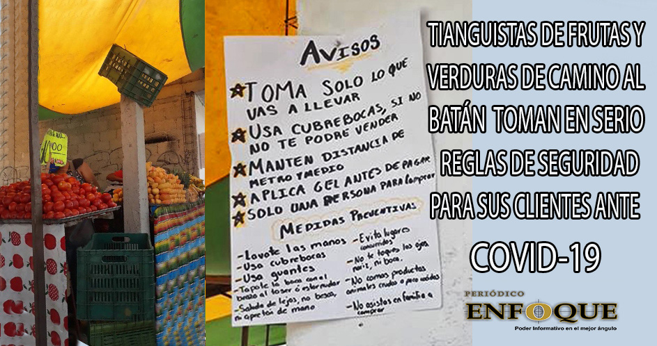 Ante la pandemia del coronavirus COVID- 19, algunos tianguistas, dueños y muy responsables, que venden frutas y verduras y que domingo a domingo se instalan en el Boulevard de Camino al Batán, en la Colonia Lomas de San Miguel, rumbo al CERESO, optaron por colocar letreros con reglas para que sus clientes compren y tengan más seguridad al hacerlo: